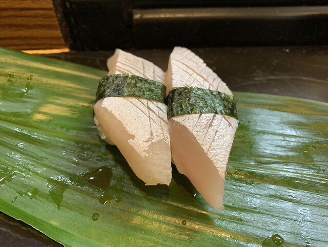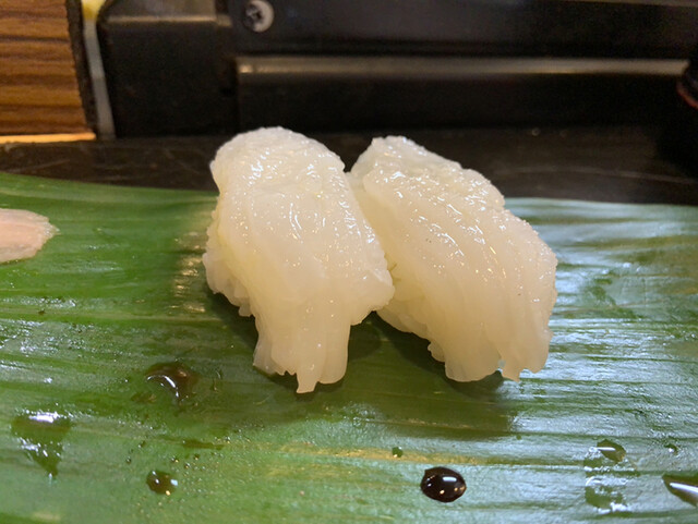 『カンパチ ズリ(495円)』醤油で食べます。これも肉厚でサクッとした食感があります。しっかりと脂が乗っていますが、さっぱりと食べられます。