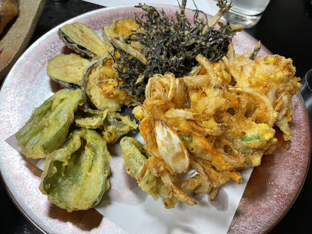 ヒジキのかき揚げ、四角豆の天ぷら、南瓜の天ぷら、野菜とエビのかき揚げ