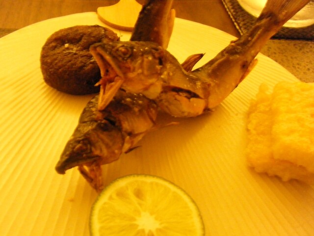 郡上・吉田川の鮎ちゃん二尾。と、もろこし天ぷら。食器は。。。うちわ(のようなモノ)?