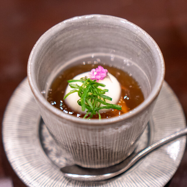 海老真薯 熊野地鶏ととうもろこしの冷製スープ 能登の絹もずく