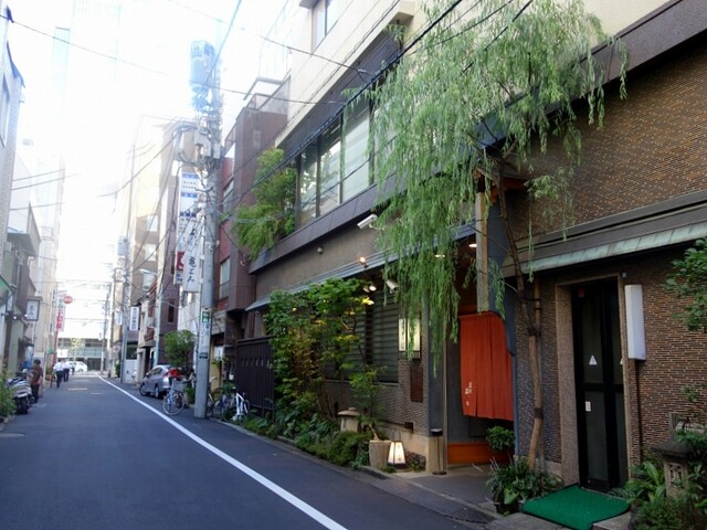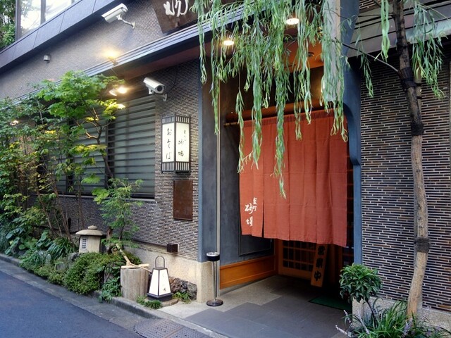 雨慕情の京都祇園の料亭街を抜けると、何処か安心感のあるファサードと赤い行灯が現れる。