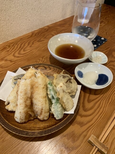 素材にしっかりと拘るご主人オススメの穴子天は盤石の美味しさ。胡麻油フワリの薄衣はサクッと軽やか、穴子はほくほくで旨味充分。塩で良し、旨い天つゆに潜らせても良しで、早くも幸せ気分。
