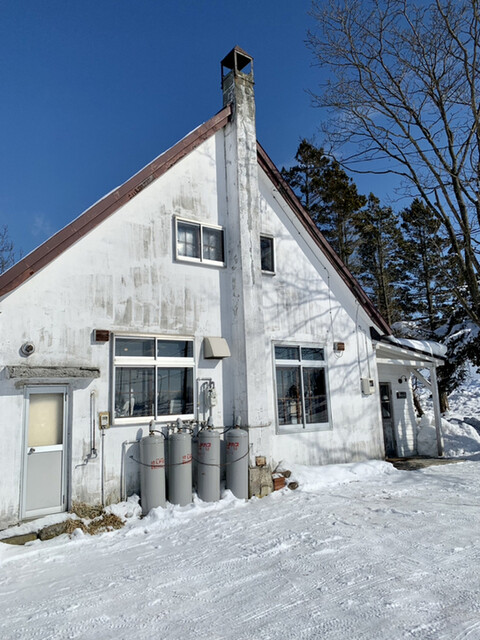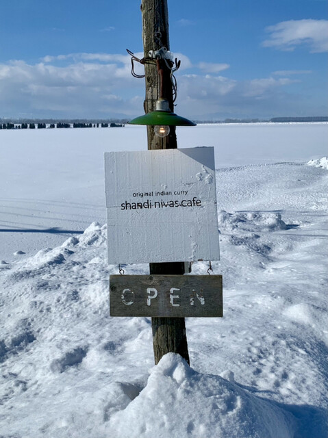 青空が映える銀世界にぽつりと佇むスパイスカフェ。薪ストーブの温もりが優しく、落ち着いたウッドのインテリアは見事に手入れされ、訪れた者の心にホッと安らぎを与える。