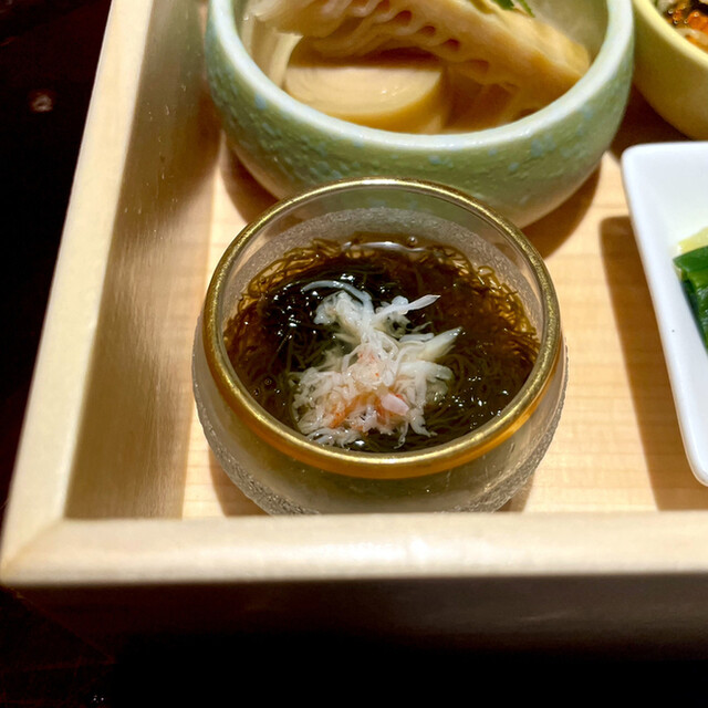 酒菜一品料理、もずく蟹身添え、蛍烏賊酢味噌和え