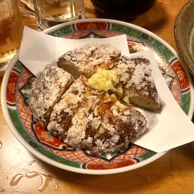 お通し、クリーミーポテサラ、鱗揚げ食感良し絶妙