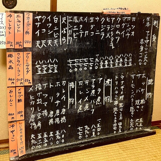 黒板メニューには、種類豊富な、本日の刺身の数々