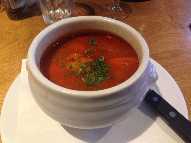人参、タマネギ、牛肉などを煮込んでシチュー様にしたトマト風味のスープ。