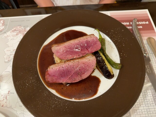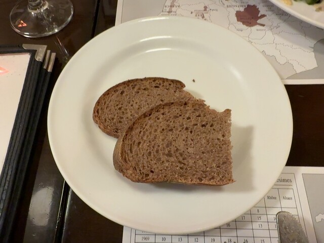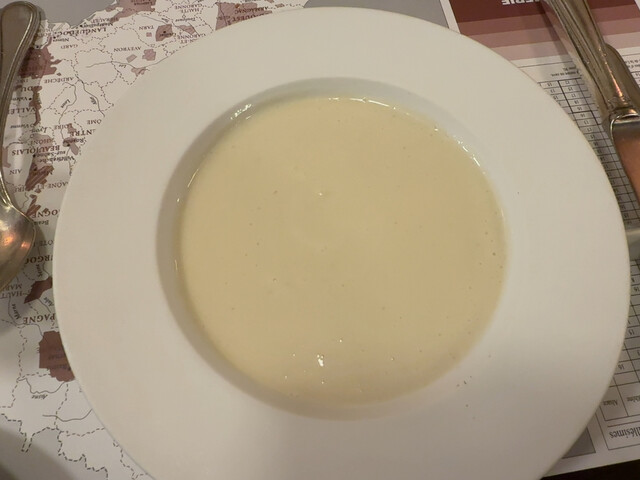 僕は前菜に豚肉のテリーヌ、スープは牛蒡のポタージュ、メインに仔羊のロースト、奥さんは前菜にレンズ豆のサラダ、カリフラワーのポタージュ、小鴨のロースト、デザートは僕がグレープフルーツのチーズケーキ、奥さんが貴腐ワインとマスカルポーネのケーキでした。