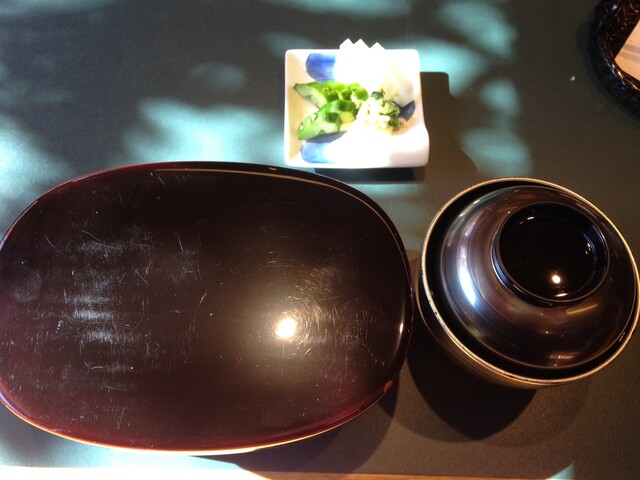 注文は鰻重定食とヒレ焼き。定食では吸い物か赤出しを選べるが、吸い物にして+100円でキモを入れてもらう。