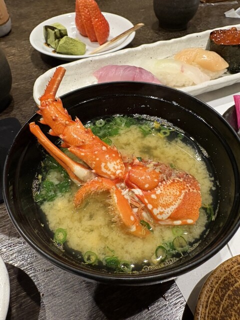 カニ身のミソ和え、刺し盛りに大きな伊勢エビにアワビ、さらにすき焼きにカニの天ぷらなどなど、締めはお寿司に伊勢エビのみそ汁美味かった!