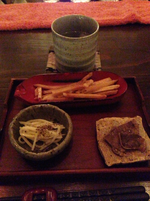重厚感ある扉の先に広がる店内は広く、カウンター正面の壁にズラーっと並べられた一升瓶と、着座後渡される分厚いメニューに2回驚く。