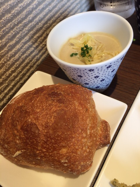 程なく運ばれてきた、「そうりのパン」と「冷製ポタージュ」と一緒に頂く。色合い、味、ボリューム、全て満足!
