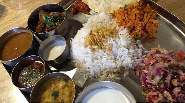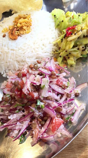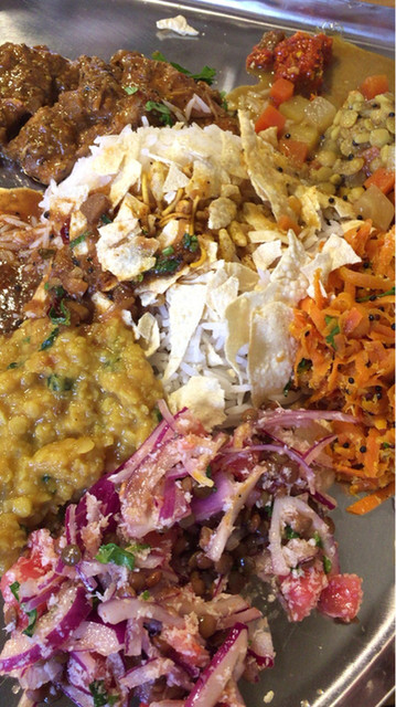 サンダル(紫玉ねぎ、キャベツ)の紫と緑、チャトニの鮮烈な赤と白、ダルの黄、各種カレーの褐色、赤、黄、このコントラストがターリー上でアートを形成。食べるのが勿体無いくらい。