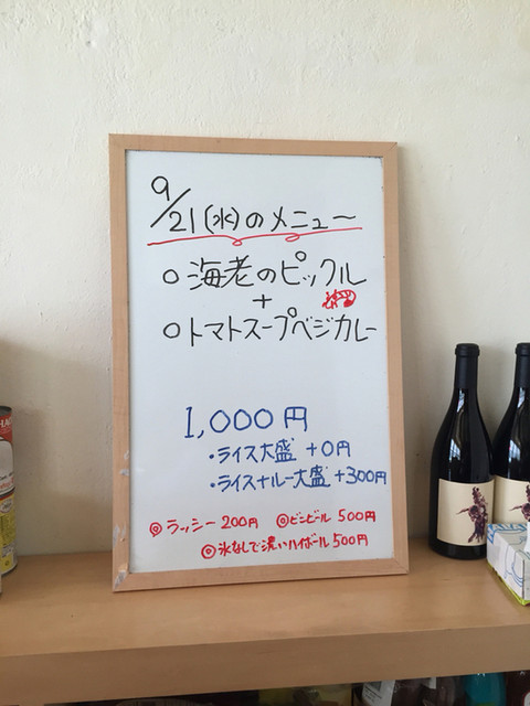 右手にホワイトボードあり。「えびのピックル & トマトスープベジカレー」とある。
