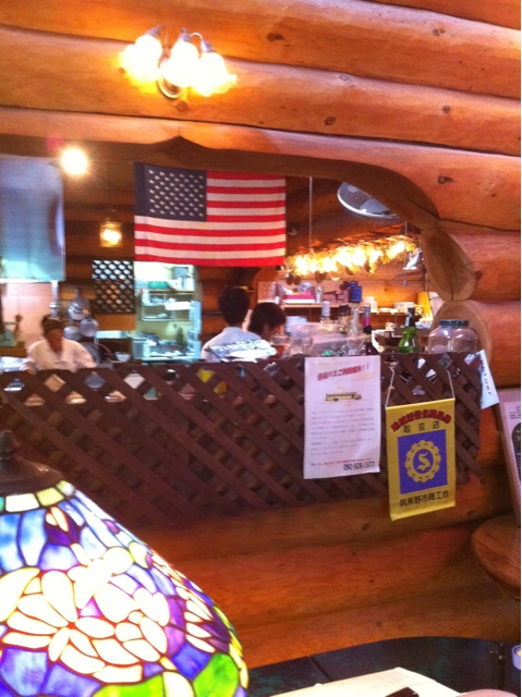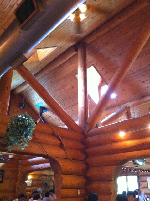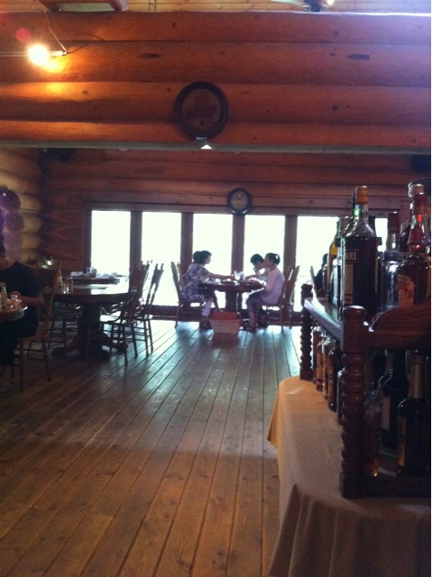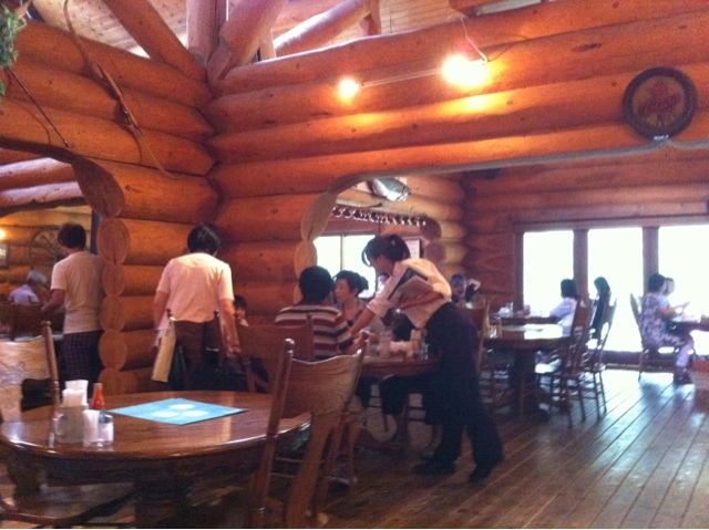 店内は天窓など自然光を最大限利用。やや薄暗いものの、丸太の壁から温かみが伝わってくるいい雰囲気。