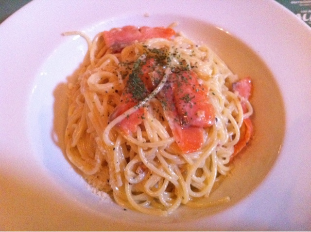 トマトソースの味が絶妙に仕上がっている。サーモンクリームのはピリっと塩辛いスモークサーモンがそえられ、パスタと和えれば丁度いい味加減。黒コショウがさらに味を引き締めている。それぞれボリュームもそこそこある本格的パスタ。