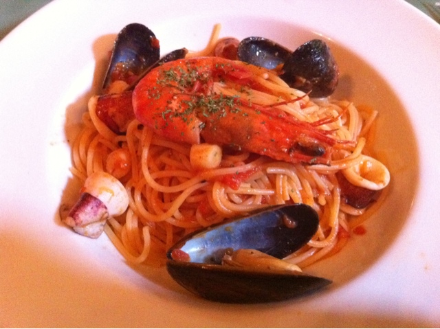 ペスカトーレは、大きめの海老、ムール貝3個、イカの輪切りが混ざり仄かな磯の香り。