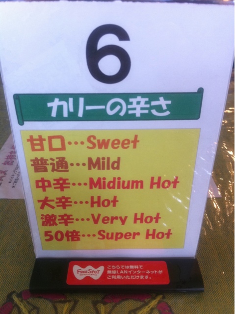 なお、辛さは、甘口、普通、中辛、大辛、激辛、50倍 と6段階から選択可。オーダー時に伝えるべし。