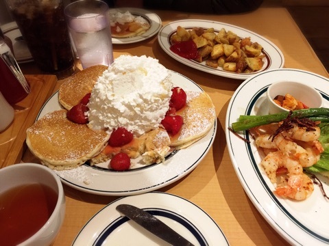 お台場のアクアシティにある「エッグスンシングス」でディナーしてきました☆待ちの列は10組位できていましたが約20分ほどで案内していただきました。店内は広くて解放感があります。オーダーしたのは☆パンケーキ ストロベリー ホイップクリーム☆見て下さいこのボリュームw(゜ー゜;)wワオッ!!パンケーキ5枚の上にはホイップクリームが山になってます(笑)スプーンを入れると雪崩がおきそうだよね(笑)まずホイップを一口。軽くてふわふわ♪甘さ控えめで美味しいですо(ж>▽<)y☆見ての通りボリュームがすごいので当然ひとりでは食べきれませんね!ふたりでも「食べきれるかな~?」って思いましたもん。(ひとりひとつづつオーダーして召し上がってる方もお見かけしましたがはたして食べきれるのでしょうか??)確かに美味しいけどこの量だと途中で飽きてしまいます(;^_^A☆ガーリックシュリンプ☆お店イチオシらしいのでオーダーしました。ガーリックの香りが食欲をそそります。エビがプリプリで美味しいо(ж>▽<)y☆もっと食べたいくらいでした♪レタスの下にはたっぷりのマッシュポテトがかくれてました^^♡アメリカンな味付けです。☆ポテト☆旦那様の大好物^^パンケーキの甘さで飽きたところでお口直しでいただきます。少し固めのポテトです。じゃがいもが固いのか、皮が固いのか謎でした!☆ドリンク、私は紅茶、旦那様はジンジャーエール☆空腹だったので、なんとか食べきれました。と言ってもほとんど旦那様ががんばりましたけどね(笑)エッグベネディクトも食べたかったな~。。。私的には、リピートするなら世界一の朝食で有名な「ビルズ」かな。久しぶりにお台場も満喫できたし楽しい夫婦デートができました♡ごちそうさまでした♡ブログからの投稿