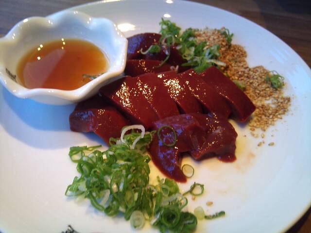 まずは、「レバ刺し」=新鮮で臭みなし!さらに超厚切りでレバ刺しが・・・皿の上で立ってます。(苦手な人も食べられます。)