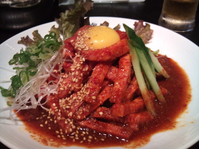 次に「ユッケ」=これも超厚切り!味付けがさいこうで、サブの野菜とも良く合ってます。