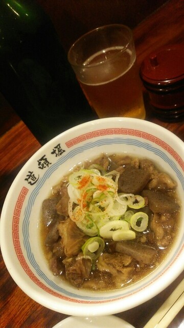 今日も、ハートランドビールと塩らーめんのワカメトッピングは、一緒ですが牛スジ煮込みが増えた点になります。はっきり言ってこのクオリティなら700円でも良い位ですが、450円。牛スジ肉を口に運ぶと舌の上でスジ肉が、ホロリと崩れてしまいます。醤油のスープは、上品なスジから出るダシがコクと旨味を醸し出してます。つい、ぬる燗を追加してしまいました。