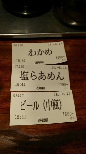 今日は、お盆の入りですが明日から休業になるので道頓堀さんに寄りました。いつものハートランドビールからの塩ラーメンに、鳴門ワカメトッピングです。昆布とチャーシューのアテを摘みながらラーメンを待ちます。今日は、夕立の為かお客様の入りが、ゆっくりの様に感じます。