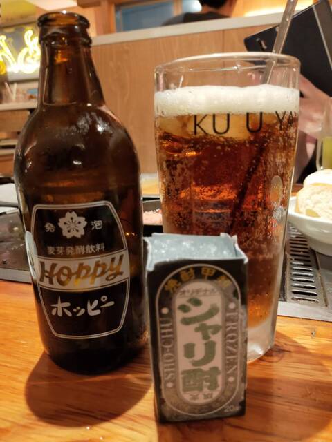 鰯は、鮮度が良く臭みもありません。暫く頂いてから身を鉄板で軽く炒めて食べたら、これも美味しい!!薬味たっぷりなのは嬉しいですねー!帆立は、目の前で手早くバター焼きして貝の皿に盛り付けます。これには、黒ホッピーセットを合わせて頂きます。ホッピーの中身は、シャリ酎で!おじさん世代には、嬉しいです。帆立も鮮度が良くて、ぷりぷりしていて、とても美味です。
