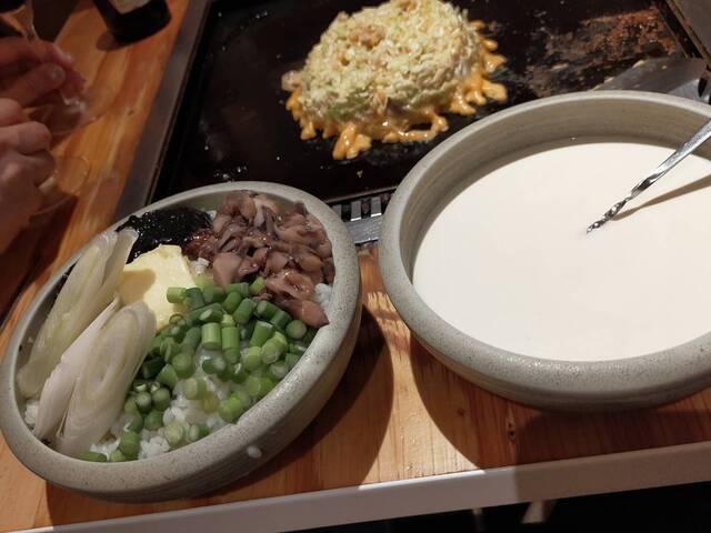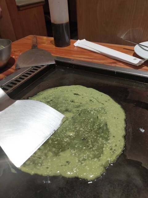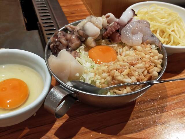 お好み焼きは、迷ってたのですが連れのリクエストから、海鮮玉に決定!中華麺と卵も別皿で来ました。店員さんの手際良いヘラ裁きで完成!海鮮の旨味がしっかり感じられる一品です。