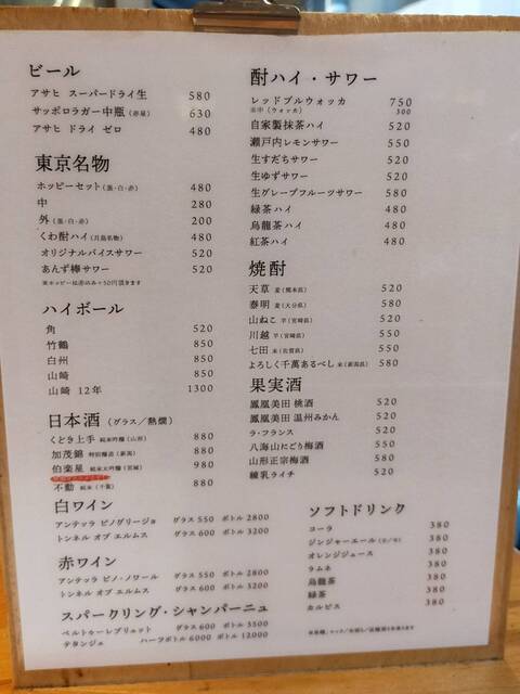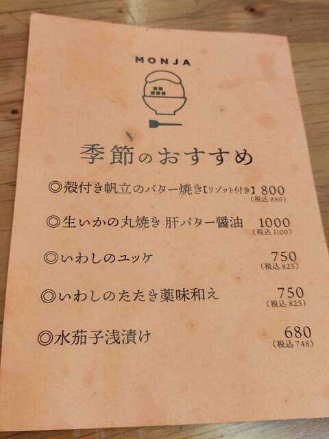 先ずメニューからオススメの「イワシのたたき薬味和え」「殻付き帆立のバター焼き」をチョイスして私が生ビールと、連れは月島名物のクワ酎ハイで乾杯しました。