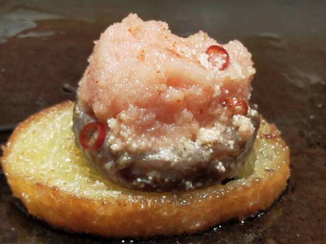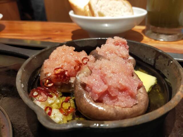 鉄板焼きのメニューから「明太子しいたけアヒージョ」「カジキマグロ キノコソース」をチョイスして、スパークリングワインを注文して、スパニッシュな組み合わせを楽しみます。カジキマグロは、マグロを名乗るけどマグロ仲間じゃないんです。でも、脂が乗ってて、キノコ入りホワイトソースとも相性が良くて旨味を倍増してくれます。明太子しいたけは、バゲットをオリーブ油に浸して鉄板で両面焼きし、明太子しいたけを乗せて頂きました。