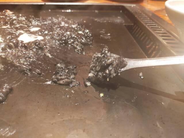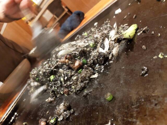 「食事2名迄は、アルコールドリンクの注文もokです。」と丁寧な説明を受けてメニューを見ました。まず今日のお通しとして烏賊ゲソが運ばれて来ました。味付けもされていて、軽く両面を焼いて頂きます。鉄板焼は、お酒のあてに良いですね!今日の流れはオススメの海鮮で行きます!