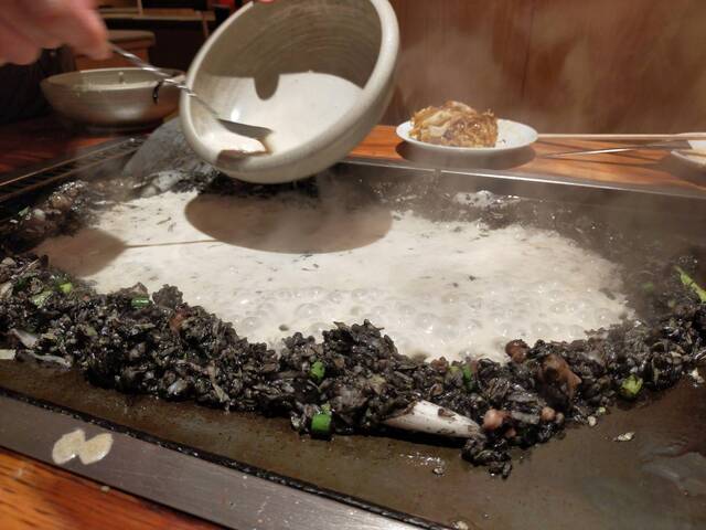 次に、もんじゃメニューから、イカスミもんじゃをチーズトッピングで注文して、これには、グラスの赤ワイン、連れは白ワインを合わせました。