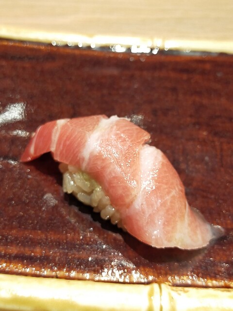握り鮨で、赤身、中とろ、シマアジ、あおり烏賊です。特にシマアジは、久しぶりに食べましたが、脂ものって上品な味わいです。