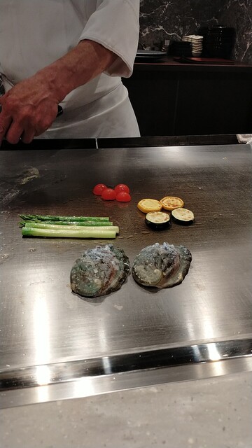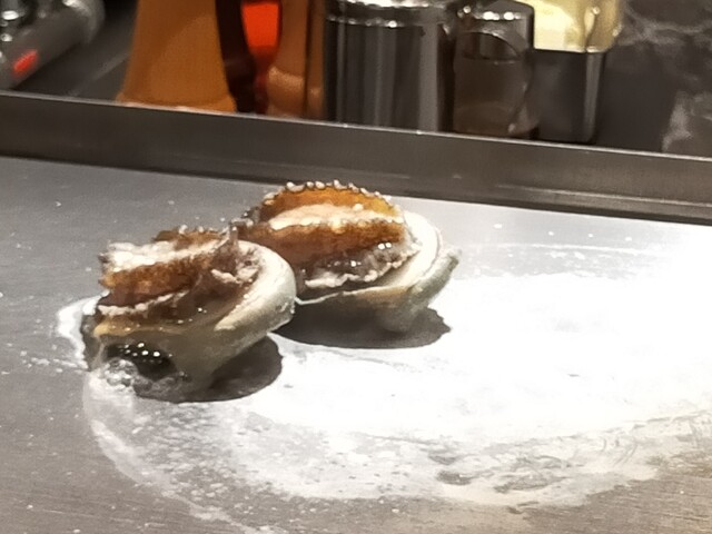 鉄板焼は三種構成です!先ず三陸産の鮑は、鉄板の上で踊って歓迎してくれてます!!盛られた皿にはパセリとにんにくのバタークリームが添えられフレンチの様、工夫が随所に見られますね~♪鮑は身も柔らかくバタークリームが旨味を引き出し絶品です!