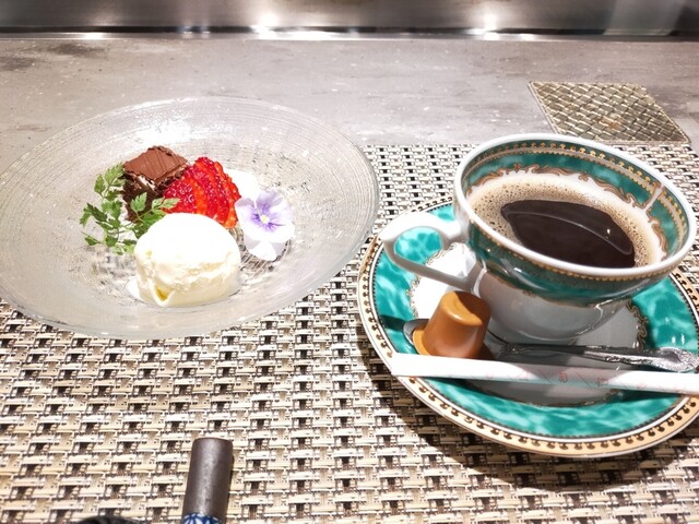 白州ハイボールを追加しました。キレのある味わいは料理を引き立ててくれます。次は三重県産の伊勢海老ですが味噌部分は料理のソースとして使っています。皿の淵に大葉を合わせた海老味噌バターソースが柔らい弾力のある身と良く合う秀逸な逸品です!次のステーキに合わせて赤ワイン(ドイツ フリードリッヒ・ベッカー ピノ・ノワール)をお願いしました。ピノノワールの特徴がしっかり出ていて美味しいです!特選神戸牛ステーキは、ミディアムレアーに焼かれ、一口頂くと肉の旨味がガツンと感じられ調味料が必要ない程。至極の時間ですね!ガーリックライスは、青森のにんにくのみじん切りを水にさらして香りを和らげる心遣いが嬉しいです!醤油の焦げた香りに喉が鳴ります。ガーリックライスにして良かった~(笑)デザートは添えられた苺と食花ビオラがデザートは別腹だよと言ってる様です!