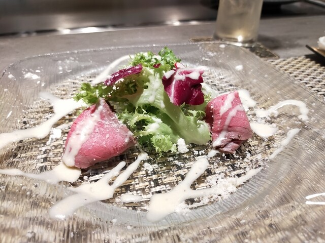 トリュフの茶碗蒸しは湯気の中からトリュフの薫りが漂ってとても美味しいです。神戸牛のローストビーフサラダはシーザーソースが相性良くて野菜とともに一気に食べてしまいました!