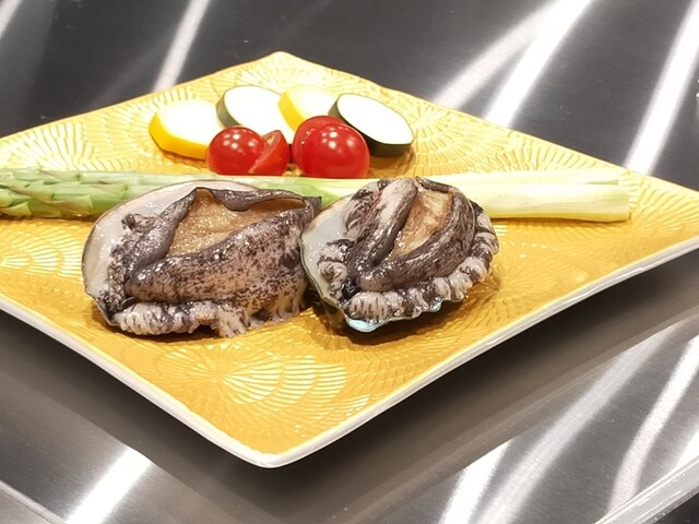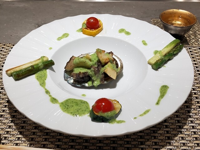 [鮑の鉄板焼き]鮑(三陸産)のパセリとにんにくのバタークリーム仕立て、グリーンアスパラ、黄ズッキーニ、緑ズッキーニ、チェリートマトを添えて