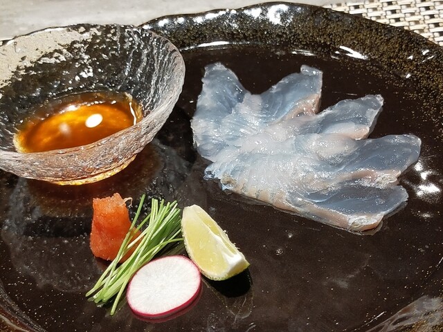 鰆の香味焼きは温かく提供され料理を楽しみながら話も弾みます。イシガレイの薄造りは、独特のいい香り、あぶらも甘い!すだちを絞り、芽ねぎを巻いて頂きました~。