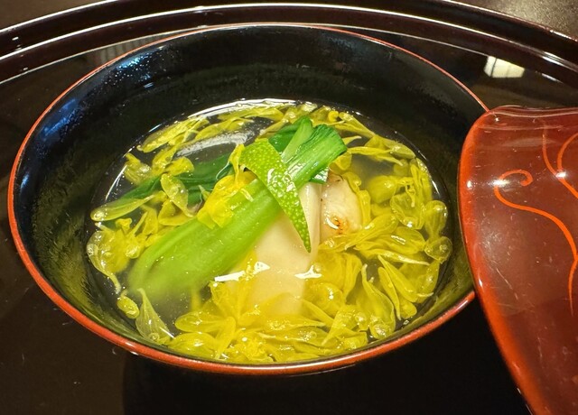 煮物椀は、菊花仕立てです。甘鯛、御所麩、鮑茸、姫青梗菜、柚子が楽しめます。