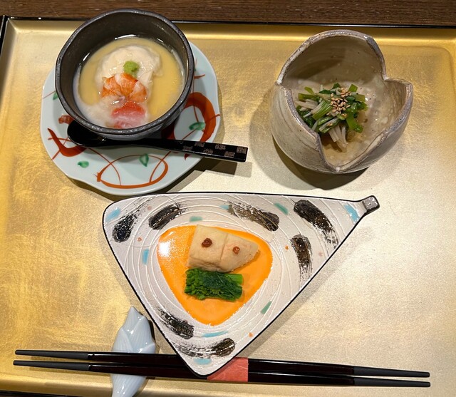 師走のお献立は、旬菜小鉢から始まります。西京味噌のクリーム和え、はもんみなかみチーズ生ハム巻き、海老芋の山芋べっ甲餡かけの三品です。