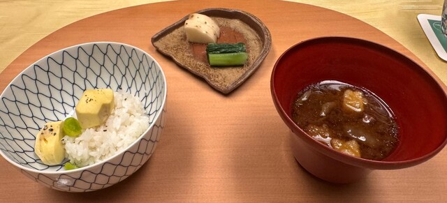 湯葉刺し、サラダには青紫蘇ドレッシング、太刀魚の幽庵焼き、ほうれん草おひたし、明太子、大根おろし、茶碗蒸しと並び、 海苔は木箱に入れられ温められて提供されました。