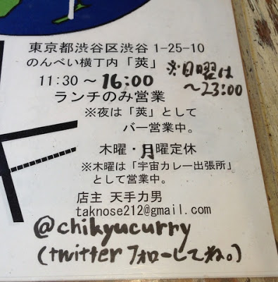 渋谷のんべい横丁でランチタイムのみ営業中のカレー屋さん(2013年4月8日より開始)。カレー好きのみなさんがハマれる本格的なカレーを週替わりで提供します。渋谷でカレーといえば地球カレー!店主は125代目の天手力男です。