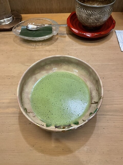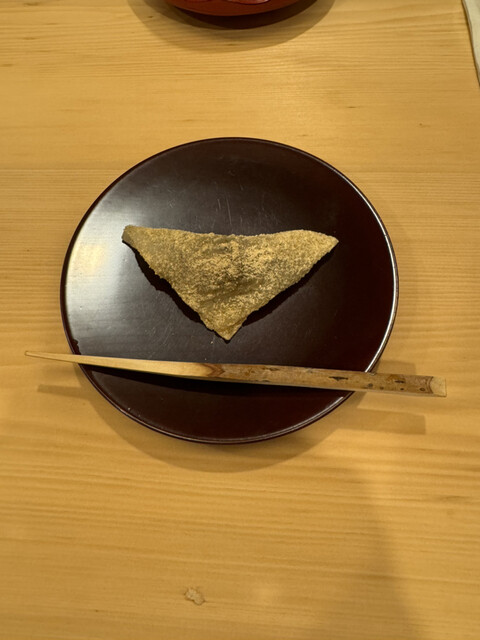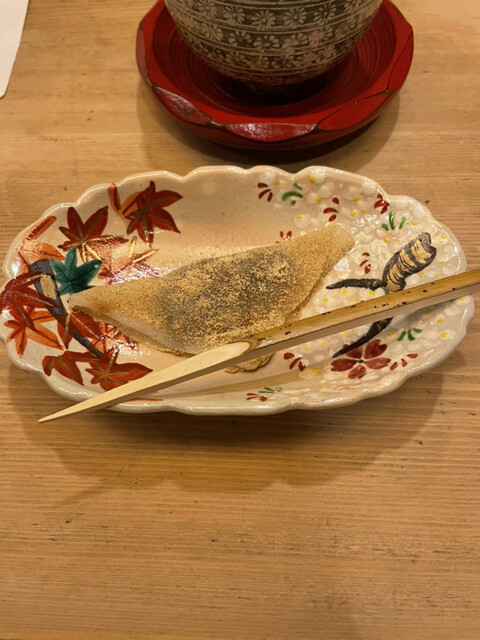 黄粉と黒蜜が蓮根餅の味を引き立ており、抹茶ととても合っており美味しかったです。