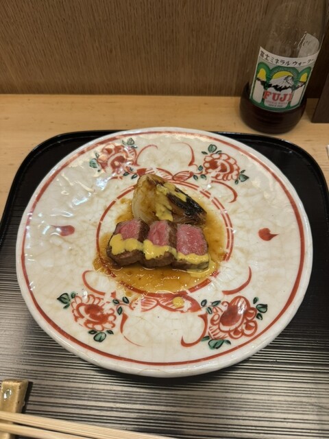 茄子の上に味噌〜その上に黒毛和牛〜その上に味噌〜辛子掛けのサンドイッチ状の一品は、黒毛和牛と白茄子がお互いを引き立てており、それを味噌が繋いで美味しさを倍増させてます。