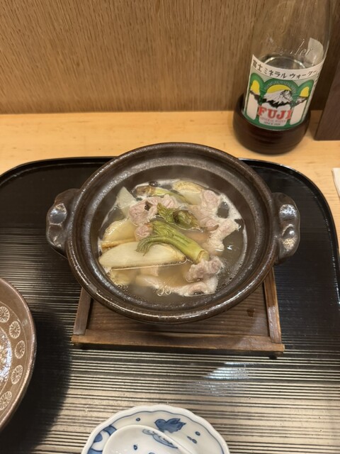 北海道の桜姫鶏と京都の九条葱と壬生菜と新銀杏のお鍋、梅のたたき。