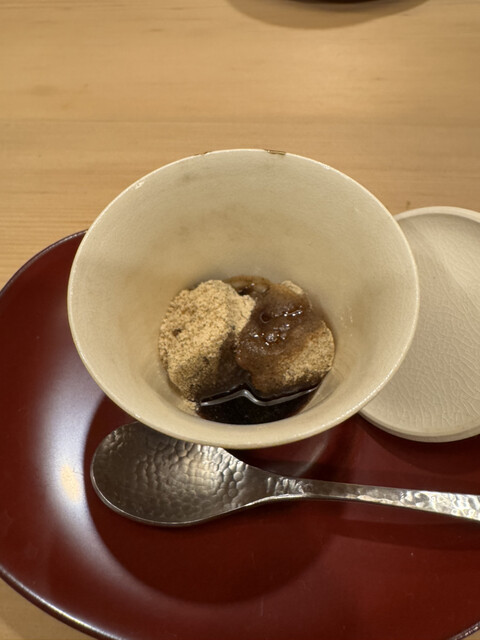 べっこう餡は、餡というよりゼラチン状ですが、これがアクセントとして湯葉と無花果といくらの味を引き立てており美味しかったです。