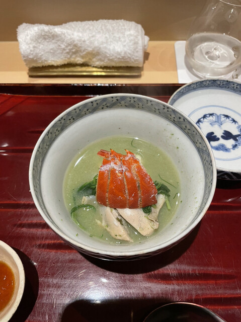 ○桑名の蛤、伊勢海老、オクラのすり流し出汁