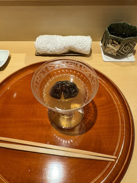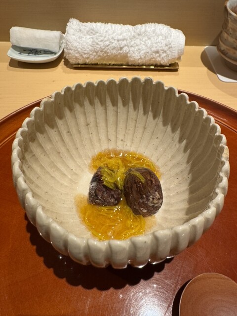八寸は、邪気を払う鬼瓦を使い、一休さんが修行されてた大徳寺の水母を使った料理や、非常に珍しい国産の岩茸の山葵和え等、バラエティーに富んだ品々で楽しませて頂きました。