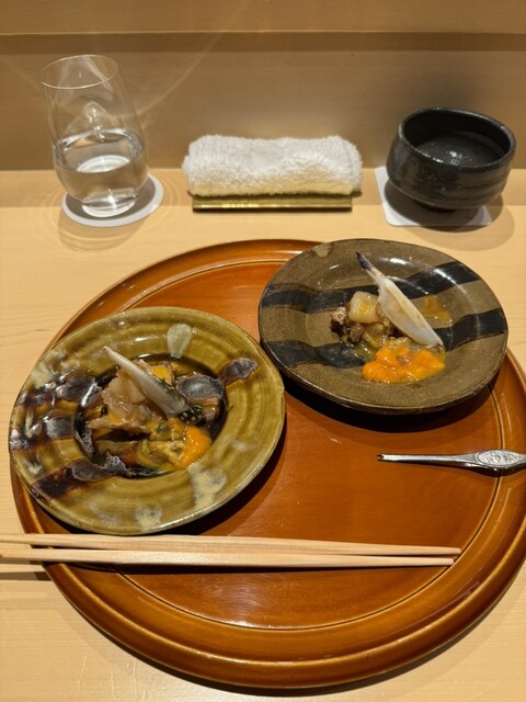 料理の方は、雲丹豆腐、帆立貝、伊勢海老、北寄貝に加減酢の煮凝り掛けで、とてもサッパリした味です。